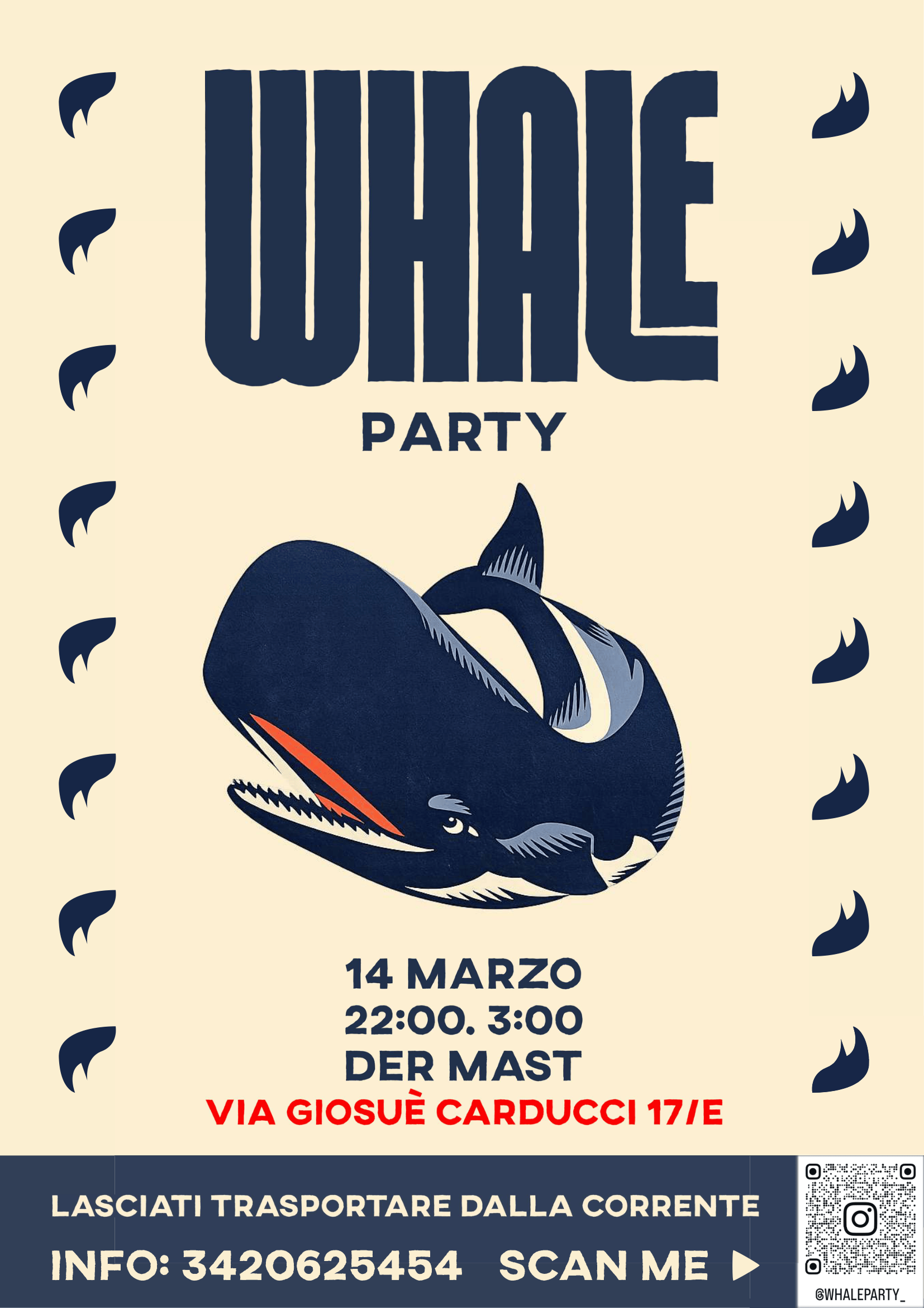WHALE PARTY sabato 14 marzo 2026 20:00 23:55 Der Mast 17e Via Giosuè Carducci Brescia, Lombardia, 25126 Italia (mappa) Google Calendar ICS WHALE PARTYLasciati trasportare dalla corrente14 MARZO22:00 - 03:00Info: 3420625454@whaleparty_