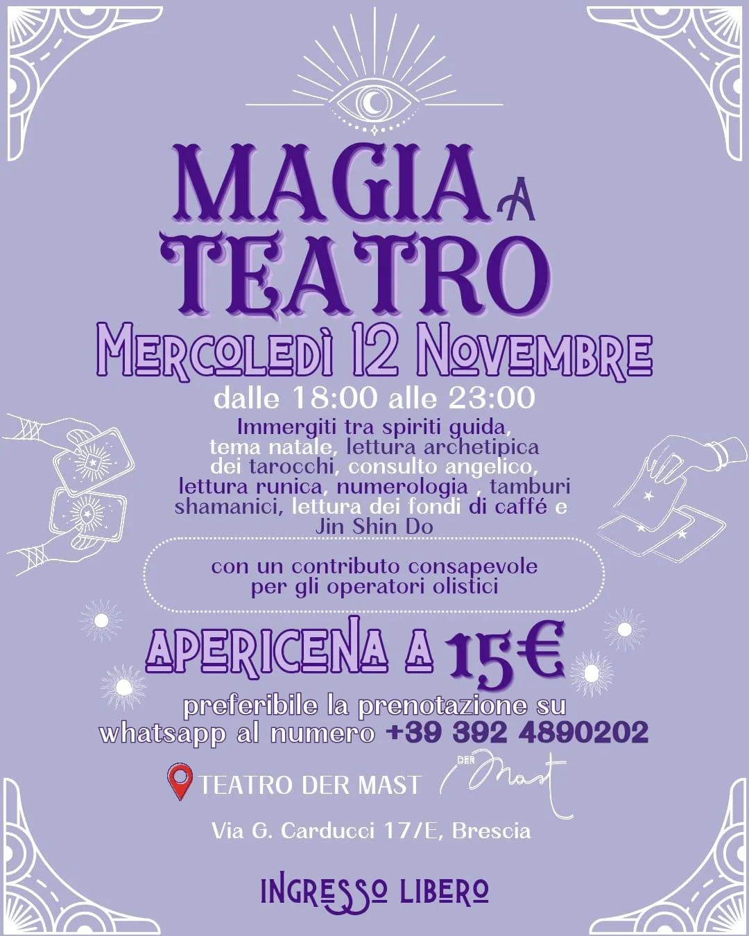 Se pensavi che a teatro si facessero solo spettacoli, TI SBAGLIAVI! Il 12 novembre dalle 18.00 preparati a un viaggio tra mistero, emozioni e consapevolezza, dove la magia entra in scena e si mescola con la vita quotidiana.